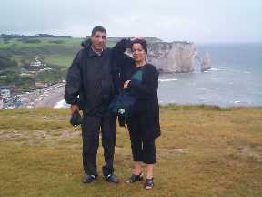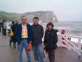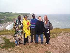 Après avoir déjeuné, nous avons repris le car en direction d'Etretat. Vous pouvez vous imaginer quel pouvait être le climat, en ce jour, au bord de la mer... Toutefois, personne n'a pu rester insensible à la beauté environnante, ce qui a largement contribué à redonner le moral aux troupes. Et même plus : nous avons vu notre ami kirghiz, Mirbek, sauté à pieds joints dans les vagues, même si le héros du jour restera sans aucun doute Lamine, qui n'a pas hésité à se devêtir et à plonger dans les flots, tout Sénégalais qu'il est ! Mais les exploits sportifs ne se sont pas arrêtés là, puisqu'après la nage, l'escalade a commencé. Motivés par la vue qui s'offrirait à eux, nombreux sont ceux qui ont escaladé la falaise, bravant le vent et la pluie. Finalement, on peut dire que cette sortie en valait la peine. Certains ont même affirmé qu'Etretat sous le vent et la pluie avait du charme, permettant presque de se glisser dans la peau d'un marin normand un jour de tempête ! Eh oui, toujours plus authentique !