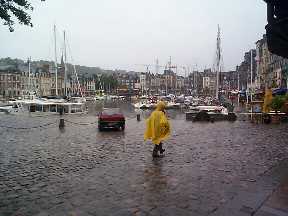 Dimanche 9 juillet, 8 heures 30. Quatre cars nous emmènent vers notre première destination : Honfleur. La pluie , fidèle compagne, est, elle aussi, du voyage. Oh, rage, oh, désespoir ! Pourquoi s'obstine-t-elle ainsi ? 9 heures 30. Arrivée à Honfleur. Nous nous dispersons dans la ville sous la pluie battante sans oublier le froid qui était également de la partie. Résultat, les stagiaires ont dû s'équiper de l'armure locale : le ciré, jaune de préférence.